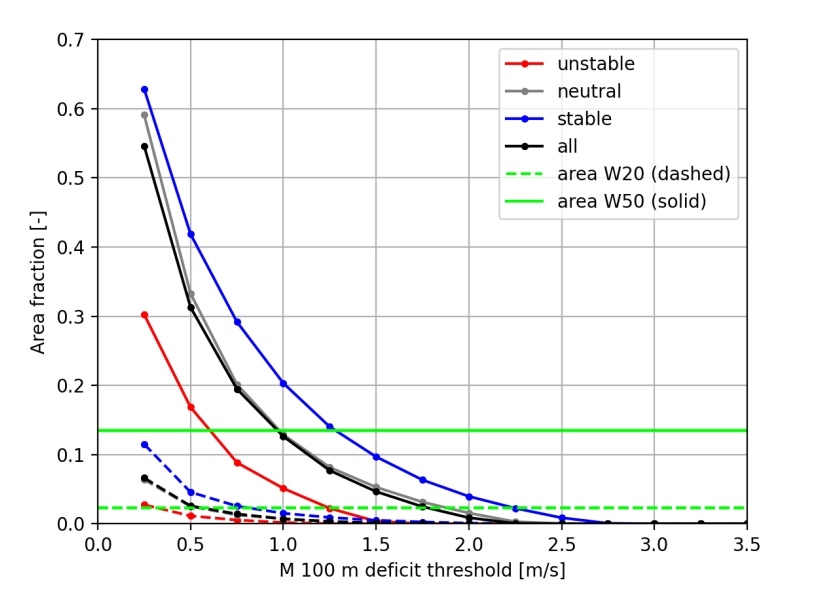 Obviously, the affected areas are much larger in the hypotheical 2050 scenario than in the present-day (2020) scenario. In the 2050 scenario on average 1/3 of the North Sea has a velocity deficit larger than 0.5 m/s, which is already a significant value. For larger threshold values the size of the affected area decreases. In stably-stratified conditions the wake-affected area is roughly twice as large as in unstable conditions.