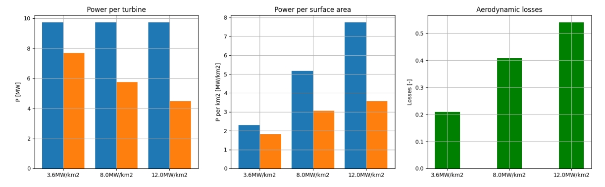 Free-stream (blue) and actual (orange) production numbers for 'infinite' wind farms with varying capacity density (left and middle panel). Corresponding aerodynamic (wake) losses (green) are presented as well (right panel).