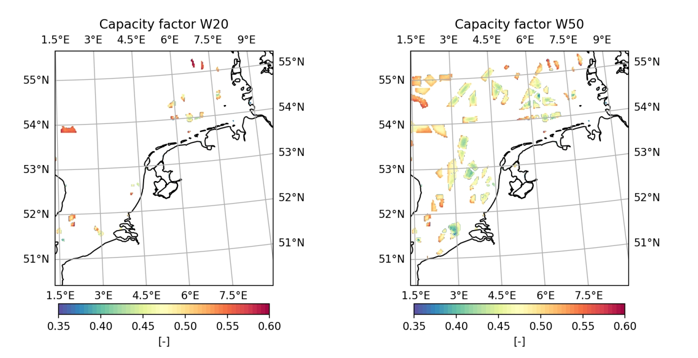 What will be the impact a tenfold increase of installed energy capacity on power production? How much will the efficiency go down as a result of farm-to-farm wake interactions? To answer these questions, we inspect the capacity factors (energy production divided by installed capacity) of the 2020 and 2050 scenarios. In the 2050 scenario capacity factors are lower than in the 2020 scenario. In the 2050 scenario (right panel) the interior of the wind farms have the lowest capacity factors.