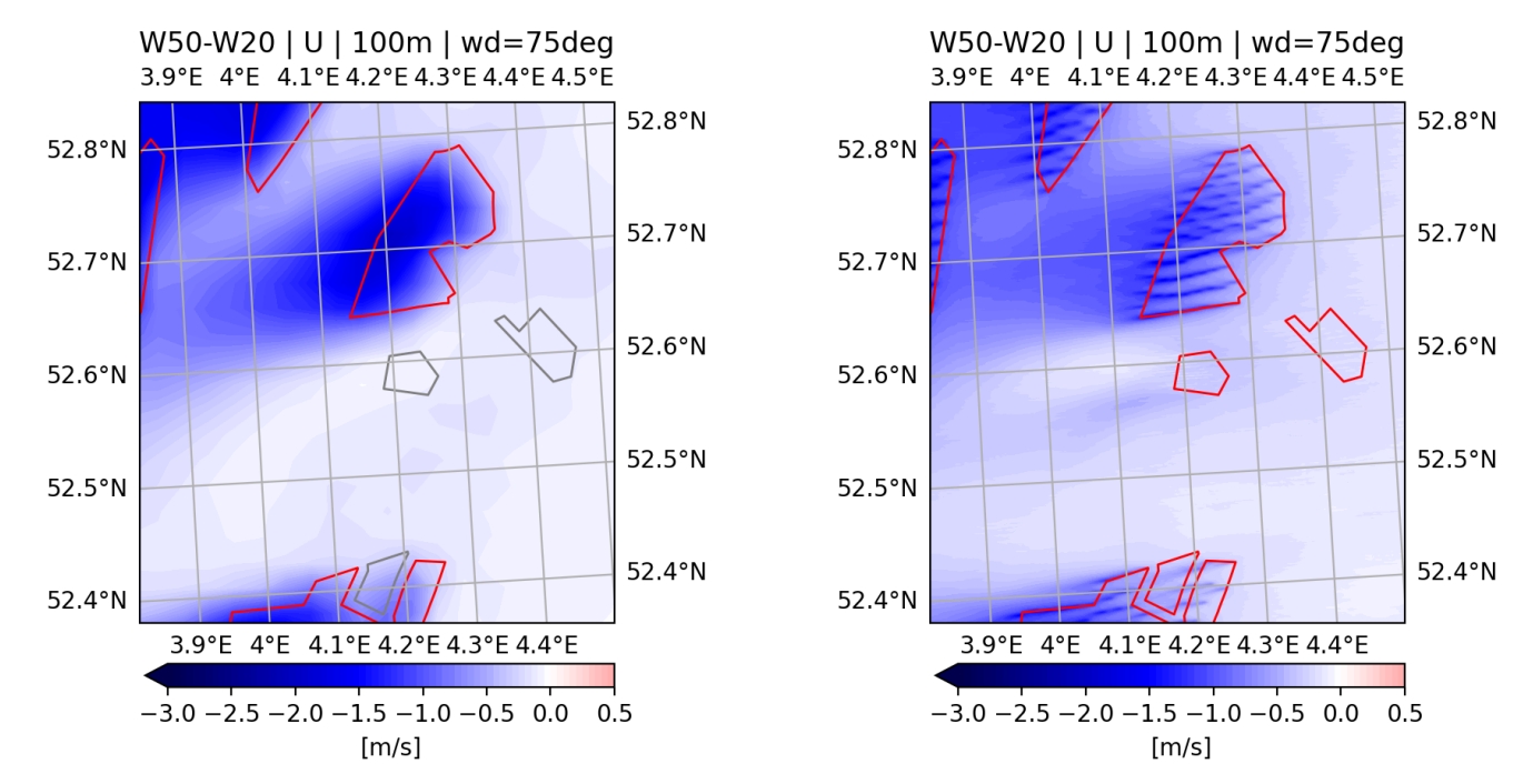 Wind farm wakes extend tens of kilometers downstream of a wind farm. This is shown in the following Figure, which shows the average 100-m velocity deficit for an area in front of the Dutch coast for northeasterly winds only. Both modes, HARMONIE-AROME and ASPIRE, show the same large-scale wake effect, but the difference in detail between the 2.5 km HARMONIE-AROME grid and the 128 m ASPIRE grid is clearly visible.