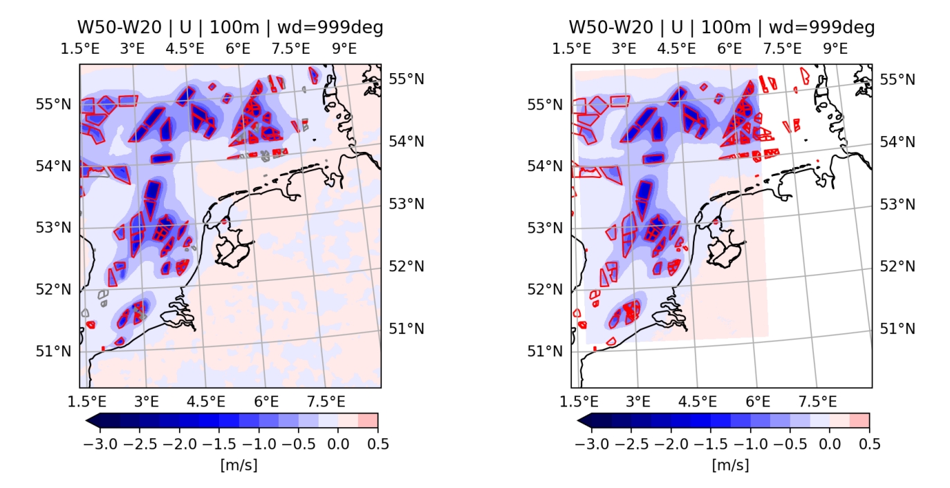 With HARMONIE-AROME, an explorative 3-months simulation was performed with the entire North Sea filled with 15 MW turbines with a capacity density of 8 MW/km2. Below Figure shows the 10 m wind speed for the HARMONIE-AROME WINS50 2050 scenario simulation and the simulation with the North Sea filled-up with wind turbines compared to the WINS50 control simulation. Obviously, the wind speed is seriously reduced in case of such a hypothetically large wind farm. Even over land a significant decrease in 10 m wind speed occurs (in contrast to the 2050 scenario).