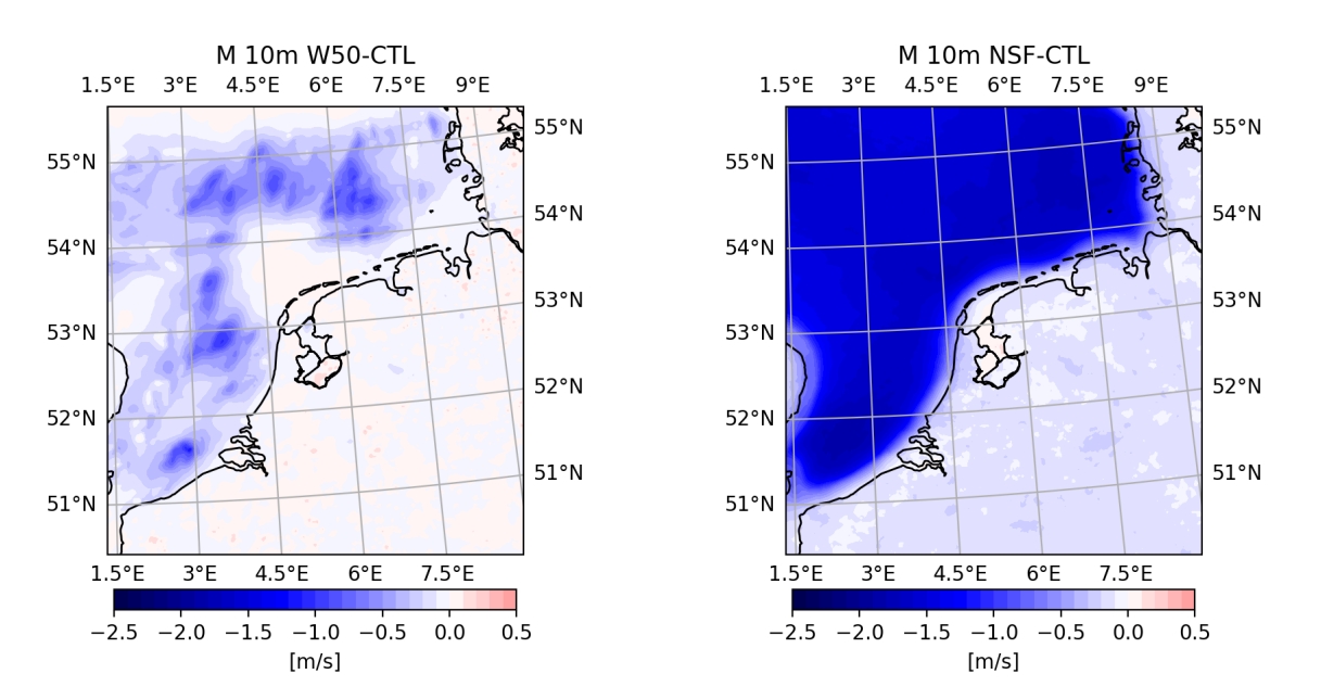 Mean HARMONIE-AROME 10 m wind speed reduction for the WINS50 2050 scenario simulation (left) and for the simulation with the North Sea filled-up with turbines (right) compared to the WINS50 control simulation.