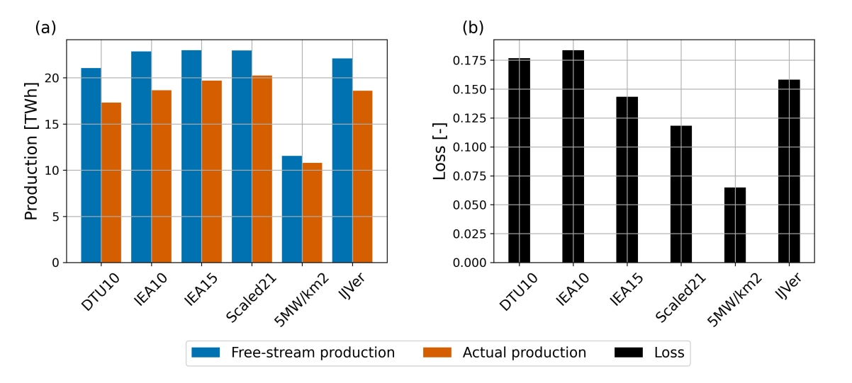Free-stream and actual power production (left) and aerodynamic losses (right) for six 4 GW offshore wind farm scenarios.