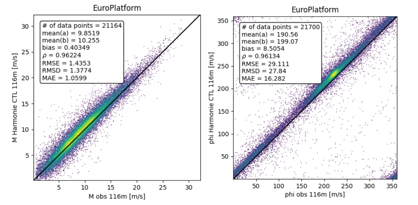Model output from the WINS50 simulations have been compared with observations. As an example, below scatter plots show modeled versus observed wind speed and direction at 116 m height for the LiDAR operated at the K13 offshore platform. It includes three years of data from the undisturbed HARMONIE-AROME simulation. For both wind speed and direction, the agreement between model and observations is excellent.