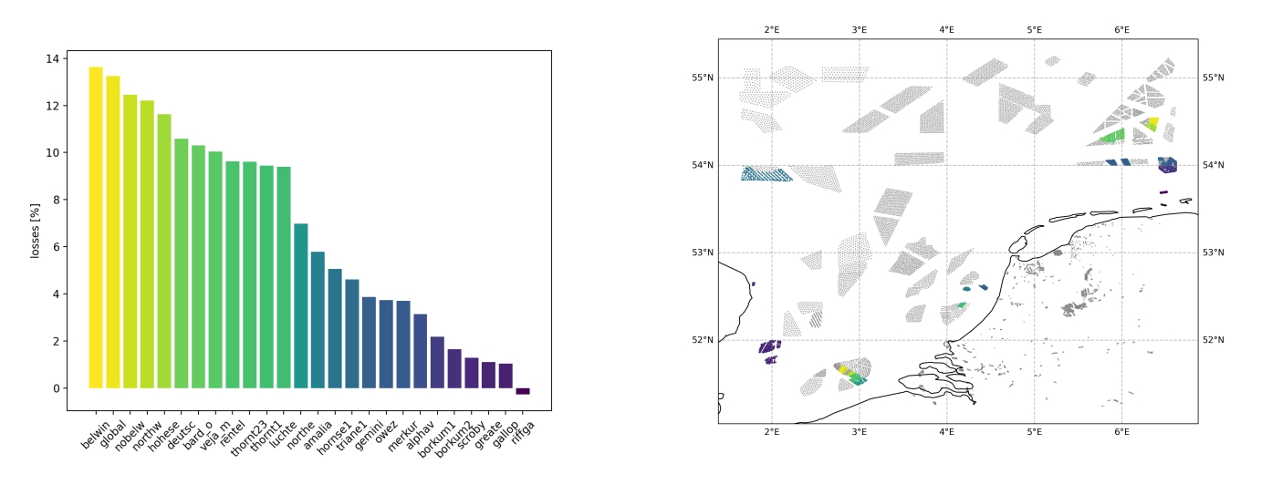 Production decrease of the 2020 wind farms in the 2050 scenario simulation in ASPIRE (left). Map of wind farms (right) with the color coding of the 2020 wind farms corresponding to the decrease in production as indicated in the left panel.